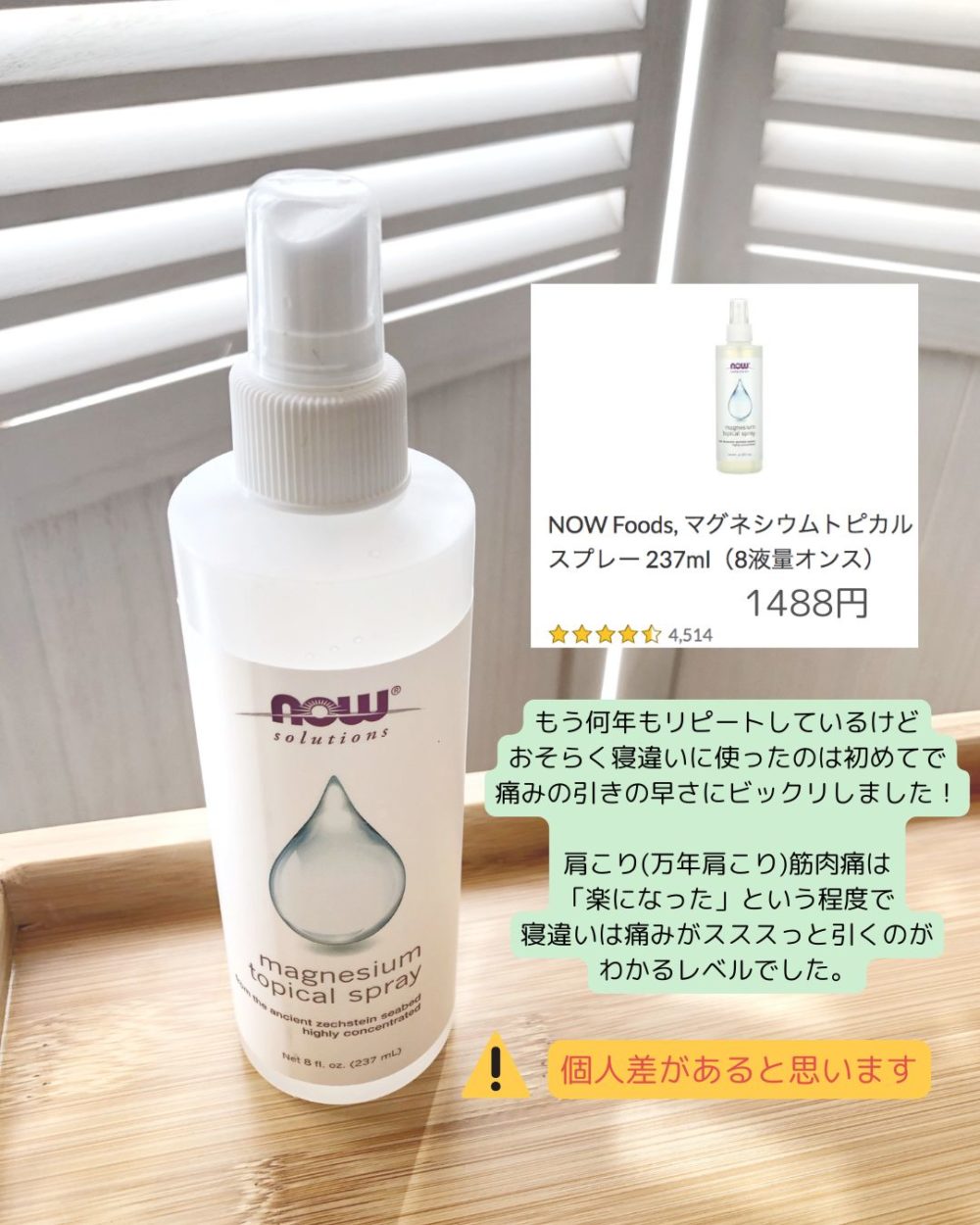 間をさほど空けず二度「寝違い」を起こし、二度とも効いたのでほぼマグネシウムオイルのおかげと確信しポストすることにしました。