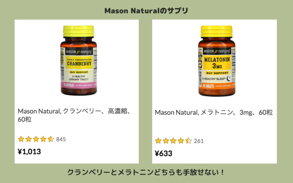 クランベリーのサプリも必需品ですが時折不眠症を引き起こしてしまうのでメラトニンも常備してます。