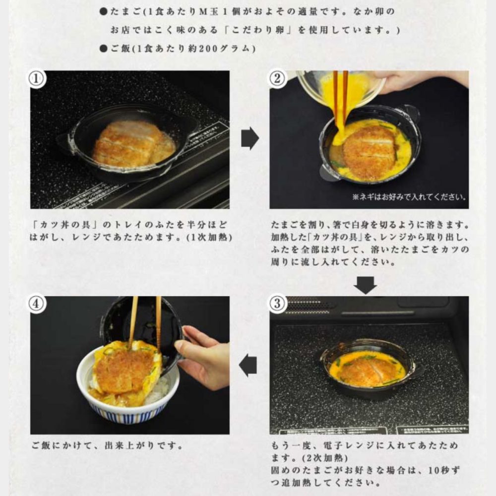 - 1回目のレンチンした「カツ丼の具」のふたを全部はがし、白身を切るように溶いた卵をカツの周りに回しかけます。