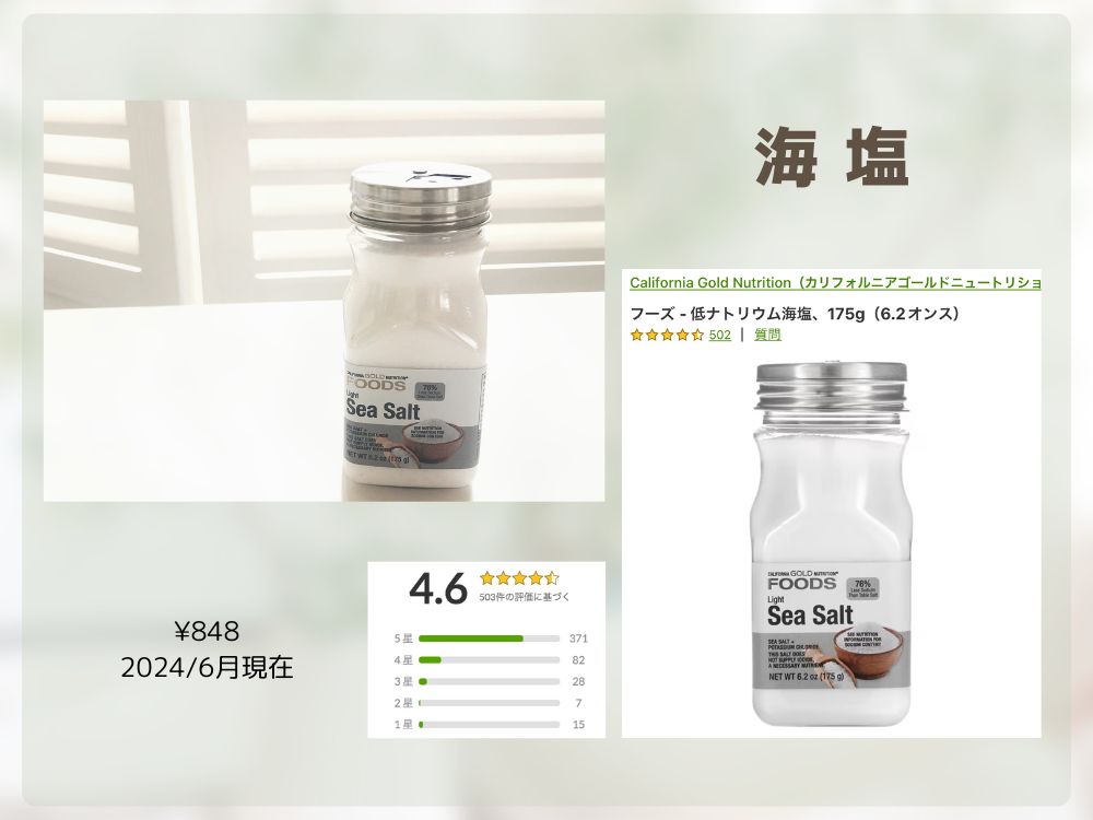iHerbサイトより・フーズ ライトシーソルトは、食卓塩に比べナトリウム分を76%カットしているため、ナトリウムを摂りすぎることなく、塩味を存分に感じることができます。・FDA(米国食品医薬品局)に登録され、、 第三者により監査されている、 現行適正製造基準(cGMP)に準拠した施設で製造されています。この施設では、これらのアレルゲンまたは成分を含む製品を加工している場合があります。