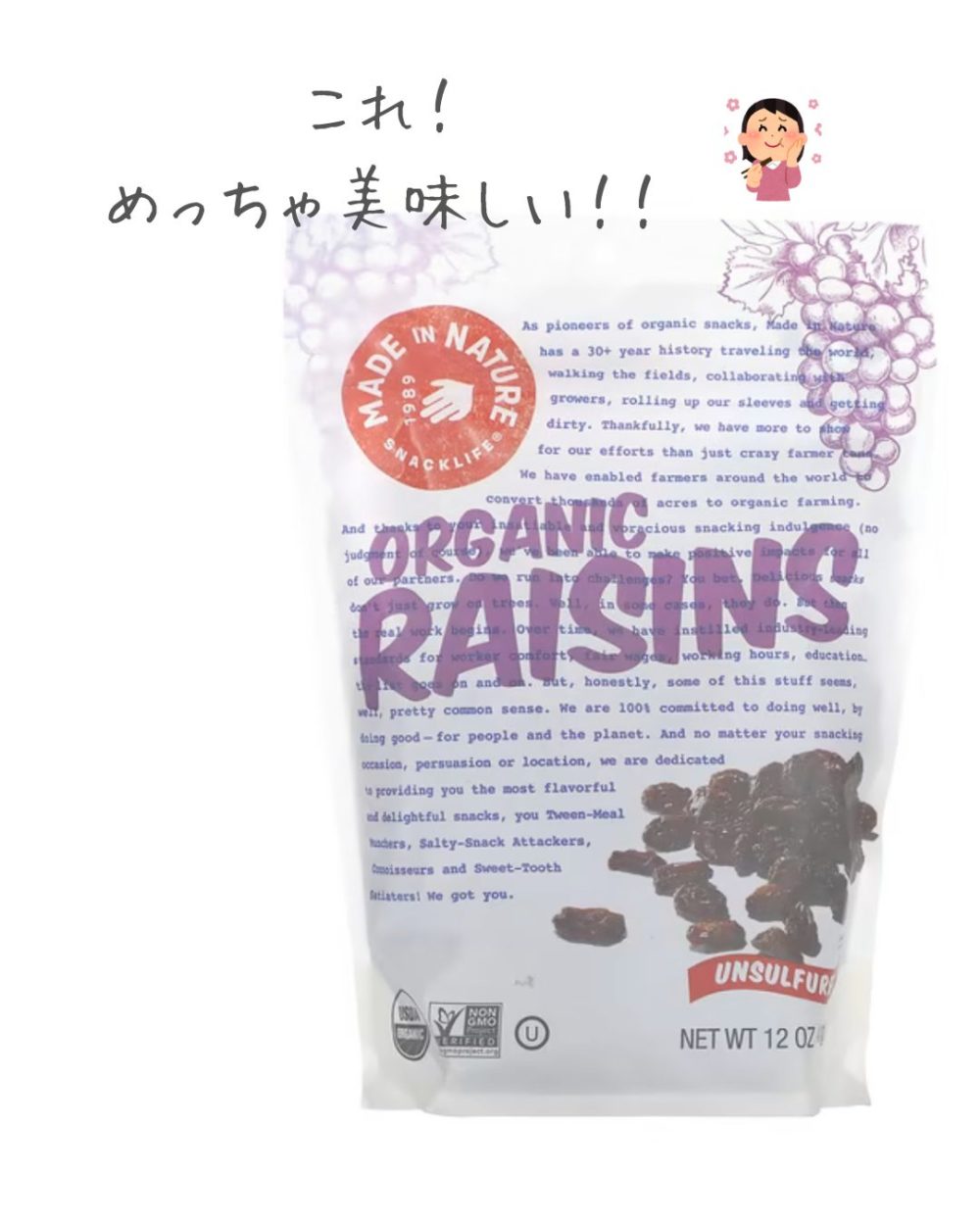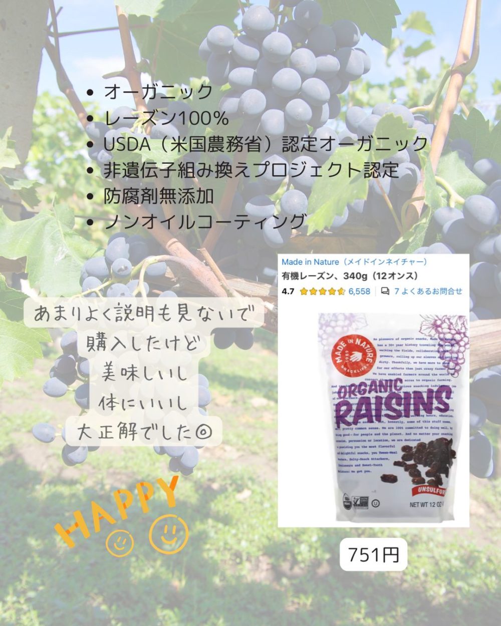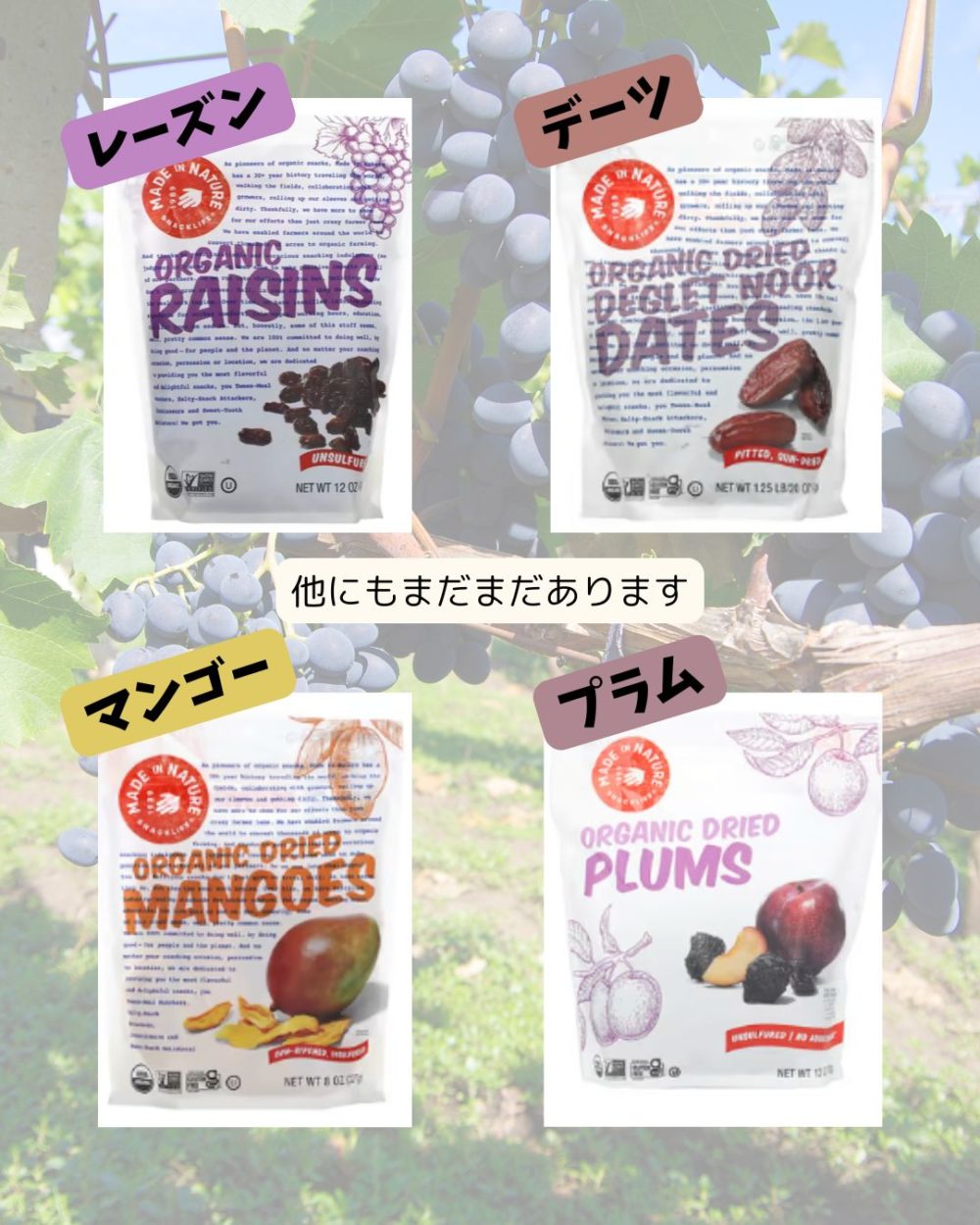 ↑はオーガニックではないですが、オーガニックレーズンも販売されてます。